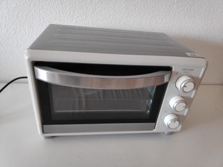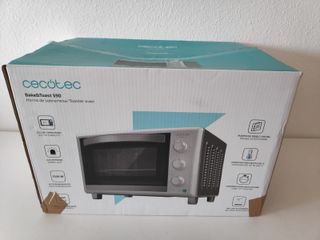 Horno de sobremesa Cecotec Bake&Toast 590 con capacidad de 23 litros. Su diseño compacto lo hace ideal para cualquier cocina. Casi sin uso, en su caja original y con accesorios incluidos. - Color blanco y gris. - Puerta con cristal. - Tres mandos giratorios para control de temperatura, función y tiempo.