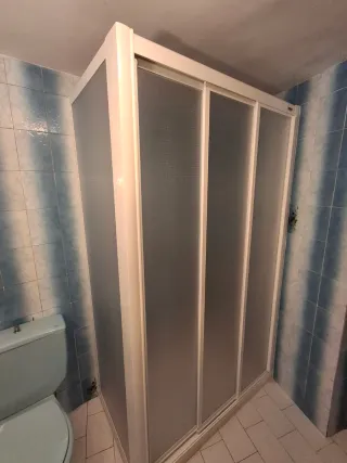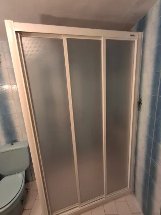 Mampara de ducha Profiltek con 3 puertas frontales correderas y lado izquierdo fijo - Fabricada en pvc - Color blanco y transparente. Medidas 116 x 67 y 195 de alto. Prácticamente nueva, se instaló pero no sé llegó a usar