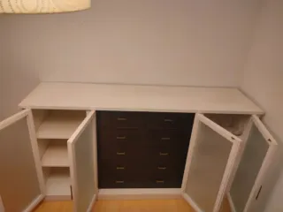 Mueble aparador con un diseño moderno y funcional. (Nada de lo que se encuentra encima está incluido) (*Si te interesa la cama y el sofa, todo se queda en 1100€*) - Acabado en madera y frentes blancos. - Tres cajones centrales. - Puertas laterales.