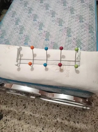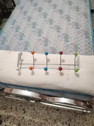 Práctico perchero para colgar detrás de la puerta. Cuenta con un diseño moderno y funcional. - Fabricado en metal cromado. - Dispone de 6 ganchos de colores (blanco, naranja, azul, rojo, verde). - Ideal para organizar abrigos, bolsos o toallas. mide 48,5 ancho 14 largo
