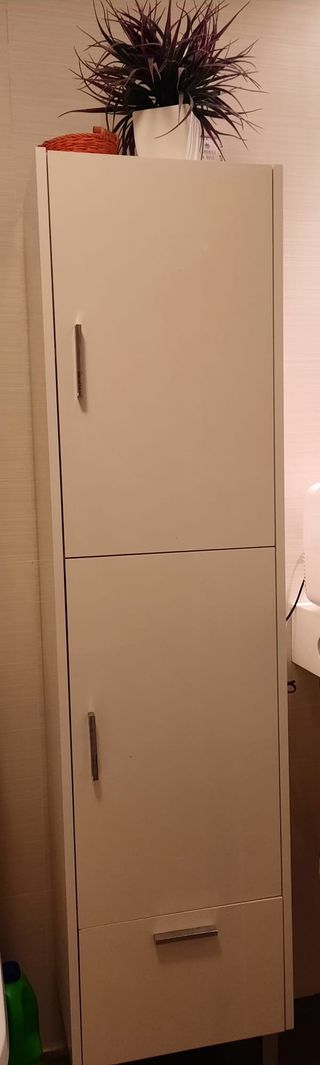 Mueble columna de baño en color blanco, ideal para aprovechar el espacio y mantener todo ordenado. Tiene varios compartimentos con puertas y un cajón inferior para guardar toallas, productos de higiene o limpieza. Está en buen estado y es muy práctico para baños pequeños o para añadir almacenamiento extra. Medidas: • Alto: 166 cm con patas (150 cm sin patas) • Ancho: 40 cm • Fondo: 27 cm
