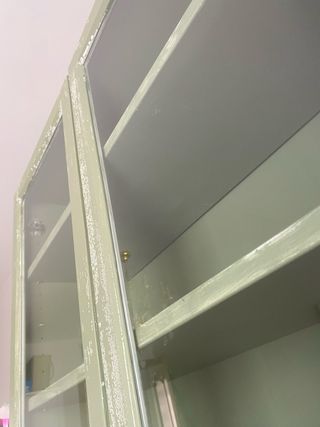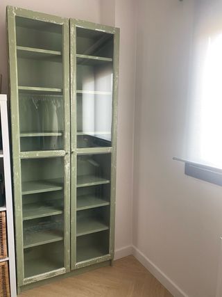 Vitrina con un encantador efecto vintage, combinando tonos verdes y blancos para un toque distintivo. - Puertas de cristal. - Estantes interiores.