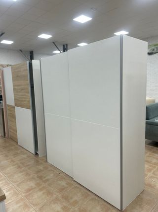 Armario de puertas correderas con un diseño moderno y limpio. - Acabado liso y brillante. - Paneles divididos en secciones. - Tiradores discretos integrados. TIENEN QUE BUSCARLO, esta sin montar .