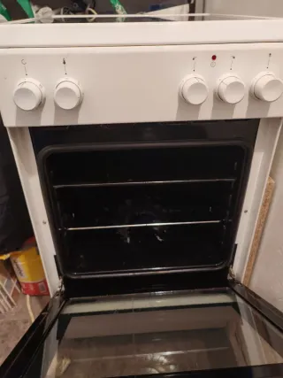 Horno blanco con vitrocerámica. - Encimera de vitrocerámica. - Panel de control con mandos. - Puerta de horno con cristal.