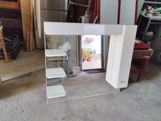 Espejo moderno con prácticos estantes. - Diseño elegante y funcional. - Estructura blanca. - Estantes de cristal. - Laterales de plástico.