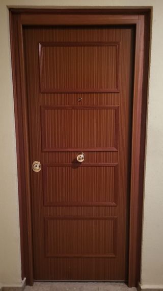 Puerta blindada con acabado sapeli. - Diseño clásico con paneles. - Incluye pomo,cerradura,cerrojo fac con 1 llave 🔑 y la cerradura principal con 1 llave 🔑 también. Mano derecha medida de hoja 82 de ancho por 203 de alto estándar cerco y jambas incluido