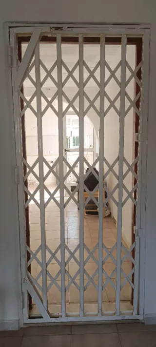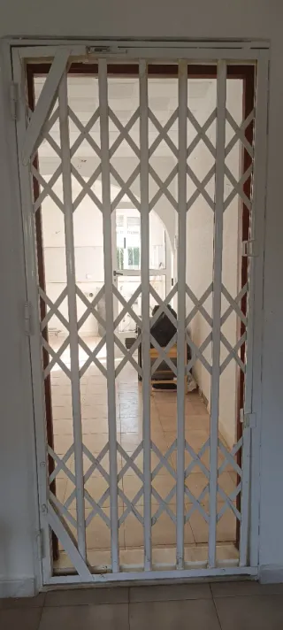 Puerta corredera de seguridad en color blanco. Medidas exteriores 90 (ancho) 203 (alto) 5 cm. (profundidad) - Diseño de reja extensible. - Marco resistente. -Disponible ya. -Recogida directa en domicilio. -Ideal para asegurar tu vivienda.