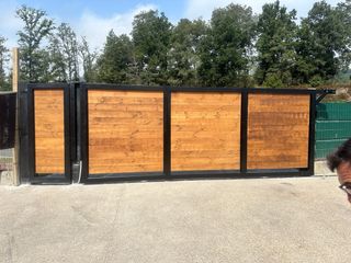 Puerta corredera de diseño moderno, combinando madera y metal. - Estructura metálica negra. - Paneles de madera con acabado natural. - Ideal para accesos exteriores.