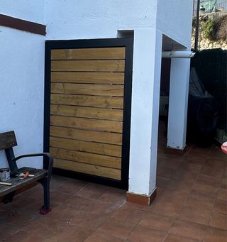 Puerta de garaje 360 x 195 con chapas basculantes en madera mas puerta de entrada 100 x 195 con cerradura y manilla - Diseño de lamas verticales. - Marco exterior en color gris oscuro. - Paneles de madera. - precio negociable - posibilidad de cortarla a 260 x 195