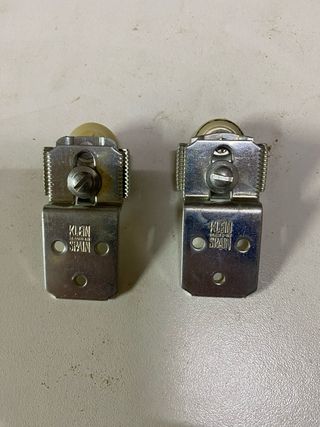Se venden dos poleas para puertas correderas. Son piezas metálicas con ruedas para facilitar el deslizamiento. - Material: Metal. - Incluye tornillería para su fijación.
