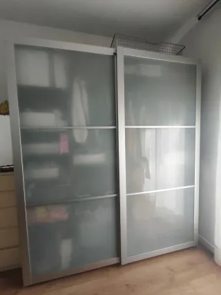 Puertas correderas para armario PAX de IKEA. 200x236 cm. - Acabado en aluminio plata y cristal translúcido. - Incluye rieles y guías para instalación. - Hay que cambiar la escobilla de las puertas, se despegan. - La puerta interior tiene alguna marca de roce de la otra puerta.