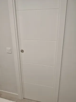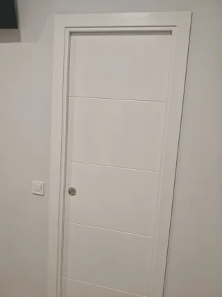 Puerta corredera de diseño moderno, sin mecanizar y a estrenar. - Color blanco. - Diseño con líneas horizontales. - Incluye manilla redonda plateada.
