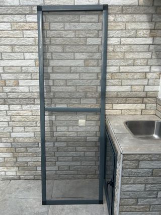 Mosquitera corredera de color gris, ideal para exteriores. - Marco de aluminio. - Malla de fibra de vidrio. - Diseño moderno. - Medidas 212,5 cm de alto, 70 cm de ancho.