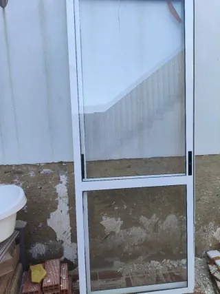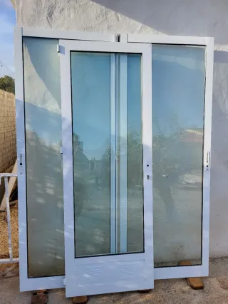 Puerta de seguridad para entrada principal (marco incluido) fabricada en aluminio de color blanco. Cuenta con un diseño elegante y un panel de cristal. - Triple cierre - Acabado en blanco. - Panel de cristal con divisiones. - Tengo 2 unidades y ventanas a juego en el perfil -200€ unidad - En caso de llevar más cosas se puede hacer precio Medidas 86,5cm ancho x 2,10 alto - Pesan bastante, lo que indica que son de calidad