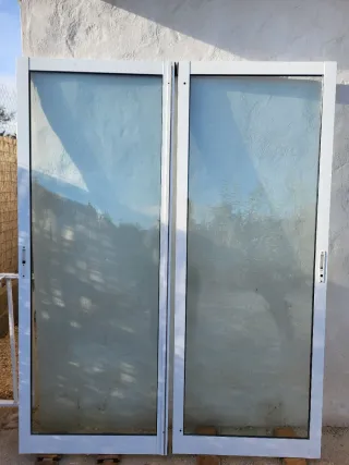 Se venden puertas correderas de aluminio con doble cristal. Son 2 hojas sin Marco. Cada una mide 78x204 cm. Precio 60€ Aparte una puerta normal con doble cristal sin marco, manivela y llave. Dimensiones interior 68x194,5. Dimensiones por exterior con la pletina 71x197,5cm. Precio 50€