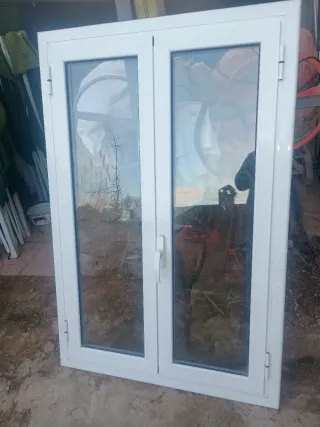Ventana de aluminio con doble cristal. Medidas para hueco de 120 ancho 151 ancho Medidas sin la parte de arriba 120 ancho 120 alto - Marco de aluminio blanco. - Doble hoja. - Vidrio transparente.