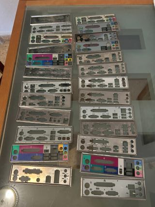 Conjunto de chapas traseras para placas base de ordenador. Son piezas metálicas que se instalan en la parte trasera de la caja del PC para cubrir los puertos de la placa base. - Material metálico. - Diseño estándar para puertos de placa base.