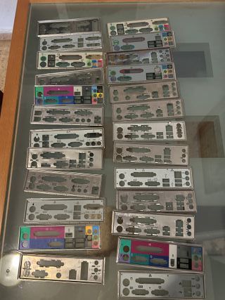 Conjunto de 25 chapas traseras para placas base, también conocidas como I/O Shields. - Piezas metálicas para puertos de conexión. - Variedad de modelos y diseños.