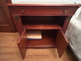 Mueble auxiliar de madera maciza/chapada en tono cerezo, estilo clásico y muy elegante. Súper práctico: cajón grande, balda abierta y armario de 2 puertas para guardar de todo sin que se vea. Ideal como mesita de noche, recibidor o mueble auxiliar en salón. Estructura sólida y estable, muy cuidado