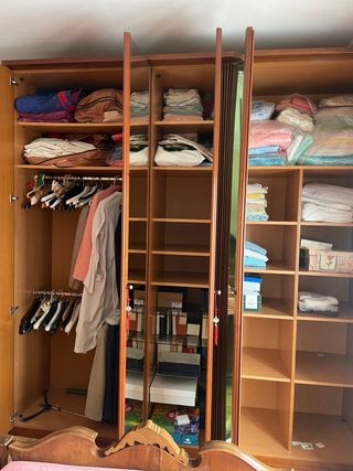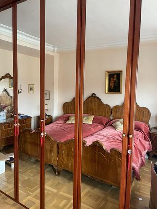 Armario de gran capacidad en madera de alta calidad, con 6 puertas, varias de ellas con espejo de cuerpo entero. Interior muy completo y funcional, ideal para dormitorio principal. Distribución interior: • Barras para colgar ropa larga y corta • Múltiples baldas regulables • Gran espacio de almacenaje • Zona central con estantes y baldas profundas Características: • Madera maciza y chapada de alta calidad • Puertas con espejo • Color madera cálido • Tiradores metálicos • Muy robusto y estable • En muy buen estado general Se vende por cambio de mobiliario. Desmontaje y transporte a cargo del comprador.