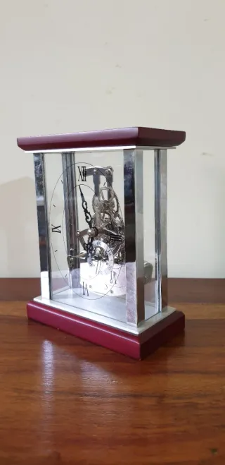 RELOJ DE SOBREMESA CON MOVIMIENTO DE CUARZO. DISEÑO DAVID PETERSON EN REINO UNIDO. Reloj de escritorio/sobremesa de latón macizo chapado en oro de 24 quilates( 24 K ), con frente de cristal, laterales y puerta trasera de vidrio. El mecanismo de cuarzo está suspendido del techo del reloj y presenta un péndulo de imitación con 2 bolas de cristal. La caja de este reloj tiene un estilo corintio, con columnas estriadas y trenzado mecanizado alrededor del dosel y la base. Madera de cerezo El mecanismo requiere 1 pila SR44 (incluida) MEDIDAS: ALTO : 16 CM. ANCHO : 13 CM. FONDO: 7 CM.