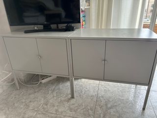 Mueble bajo de diseño moderno con acabado en chapa gris. - Dos puertas con tiradores redondos. - Patas metálicas finas. - Amplia superficie superior.