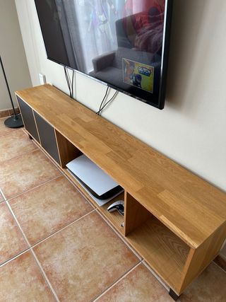 Mueble de televisión con acabado en chapa de roble y detalles en negro. Diseño moderno y funcional. - Acabado en chapa de roble. - 2 Puertas frontales forradas con vinilo color negro. - Amplio espacio de almacenamiento. - Medidas 174x30x44cm de alto con las patas que se pueden quitar y colgar en la pared - Tiene un rayon en una esquina