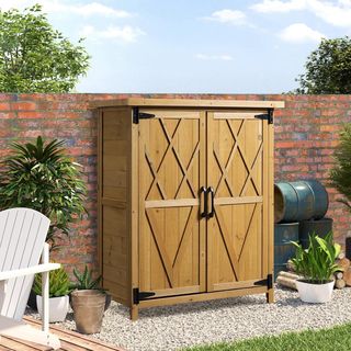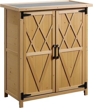 ARMARIO DE JARDÍN COMPACTO: Caseta para herramientas con 4 estantes a la derecha y amplio espacio a la izquierda. Fabricado en madera de abeto con tratamiento impermeabilizante, resiste a los agentes atmosféricos. Mesa de trabajo en chapa galvanizada para evitar filtraciones de agua. Puertas con cierre magnético y base elevada para proteger de la humedad y el frío. Dimensiones: 75L x 40P x 90A cm; cada puerta: 31L x 76A cm; capacidad de peso: 10 kg por estante. Incluye armario y manual de instrucciones. Fácil de montar. Color: Amarillo.