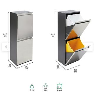 ARREGUI Vario CR205 Cubo de basura y reciclaje de acero inoxidable de 2 cubos, mueble de reciclaje para exterior o interior, 2 x 16 L (32 L) El cubo de basura y reciclaje Arregui VARIO de 2 cubos mide 89,5 cm de alto, 31,6 cm de ancho y 25 cm de fondo. Tiene un peso de 12,7 kg. - Cuando el cajón está totalmente abierto la distancia hasta el fondo es de 50 cm. - Cada cubo de plástico interior tiene 25,5 cm de ancho, 23 cm de fondo y 34,5 cm de altura, altura que permite que quepa dentro cualquier botella de vidrio común. El cuerpo del Arregui VARIO está fabricado en acero lacado en gris oscuro y las puertas son de chapa de a...