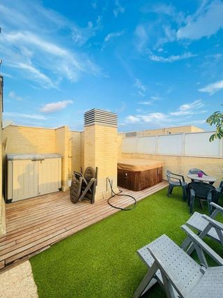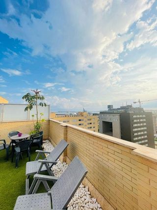 *Mérito Inmoservicios* Miembro en el Registro de Agentes de Intermediación Inmobiliaria RAICV 5846. API 02178. -Ref: MV-2462- Increíble Ático-dúplex en Oscar Esplá, Alicante con jacuzzi privado. El ático consta de vestíbulo, salón-comedor, terraza exterior, distribuidor, tres dormitorios, cocina con lavadero, dos cuartos de baño y terraza solárium. Sus características se compone de: Puerta de acceso acorazada de madera chapada en roble. Videoportero. Armarios con puertas de roble lisas, forrados e iluminados interiormente con interruptor. Carpintería exterior de aluminio con doble acristalamiento para aislamiento térmico y acústico. Persianas de aluminio accionadas mediante torno en dormitorios y mecanismo eléctrico con mando a distancia en salón-comedor. Tarima flotante de madera de roble sobre lámina anti-impacto como aislamiento acústico, en toda la vivienda excepto en cocina, baños y exteriores. Baño principal con suelo y revestimientos de mármol travertino y bañera de hidromasaje y mampara. Baño secundario con suelo y revestimientos de piedra natural con columna de hidromasaje y mampara. Tomas de TV, F. M. y teléfono en salón, dormitorios y cocina. Cocina equipada con muebles bajos y altos hasta el techo; iluminación de la encimera mediante pantallas fluorescentes adosadas a los muebles altos. Lavavajillas panelado, horno de acero inoxidable, placa vitrocerámica y campana decorativa con extractor. Toma de agua prevista para frigorífico. Caldera estanca de gas de la marca Roca modelo Laura 30AF, con acumulador de agua caliente de 100 litros. Gas ciudad. Instalación completa de aire acondicionado con bomba de calor, mediante conductos con zonificación independiente en salón y dormitorios. Instalación de calefacción mediante radiadores Roca. Radiador tipo toallero en los baños. Descalcificador de agua corriente comunitario. Caja fuerte en dormitorio principal. Instalación de sistema domótico incluyendo detector de presencia, de agua, de gas y de temperatura. Te