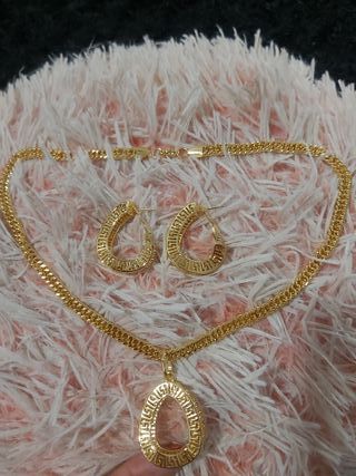 Precioso Conjunto Collar + Pendientes Chapado en Oro 18K. diseño con patrón Griego. Ideal para fiestas, fiestas de boda. el Collar como los Pendientes son ligeros, no pesan. y quedan preciosos. Nuevo. Medidas: 47cm. (cadena) x 4.7cm. alto x 2.7cm. ancho (colgante). 3.3cm. de alto x 2.7cm. de ancho (pendientes). Hago envíos, entrego en manos en Puerta del ángel. #conjuntochapadoenoro18K #collarypendienteschapadoenoro18K #Joyeríachapadoenoro18k #conjuntojoyeríachapadoenoro18k #Conjuntobodachapadoenoro