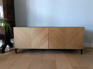Mueble de TV de diseño moderno con acabado en madera y detalles en negro. - Medidas: 120 cm de ancho, 41 cm de profundidad y 48 cm de alto. - Patas metálicas negras. - Diseño con puertas de chapa de roble con veta en espiga.