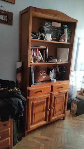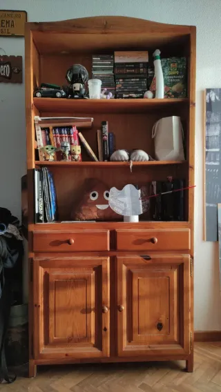 Mueble de almacenamiento con varios estantes y puertas. - Diseño clásico. - Acabado en madera natural. Tiene un par de defectos, aunque nada grave. Lo primero, tiene un pequeño agujero en la chapa trasera. Eso es porque por ahí pasaba un cable eléctrico. Lo segundo es que las dos puertas cierran pero están algo duras. Tendrá unos 35-40 años, creo que para el tiempo que tiene está bastante bien. Mide 194 centímetros de alto, 91 de ancho y 32 de profundidad.