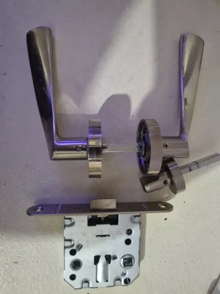 Conjunto de cinco chapas para puertas, ideales para renovar o instalar en tu hogar. - Material: Metal plateado. - Diseño: Manillas tipo palanca.