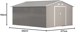 Amplia casita de jardín de chapa de acero coloreado, resistente a las inclemencias del tiempo. Dimensiones externas: 277L x 195P x 192A cm; internas: 267L x 181P x 192A cm. Incluye 4 salidas de aire y 2 puertas correderas para una ventilación óptima, evitando humedad y malos olores. El techo inclinado previene la acumulación de agua. Montaje requerido; no incluye suelo, pero tiene fundamentos para una superficie plana. Altura de la puerta: 96L x 152P cm. Sigue las instrucciones, ten cuidado con los bordes afilados y usa guantes de trabajo. Solicita ayuda si es necesario para la instalación.