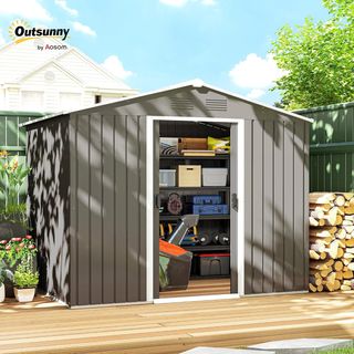 Amplia casita de jardín con gran espacio interior, ideal para herramientas de jardinería, accesorios para piscina y más. Fabricada en resistente acero pintado con acabado resistente a la intemperie, para un uso exterior duradero. El techo inclinado evita la acumulación de agua de lluvia, protegiendo de daños. Las 4 salidas de aire y 2 puertas correderas mejoran la ventilación, reduciendo la humedad y los malos olores. Dimensiones generales: 277L x 195P x 192A cm; dimensiones internas: 267L x 181P x 192A cm. Montaje requerido. Nota: producto dotado solo de fondo, instalar sobre superficie plana.