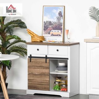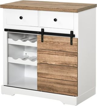 Credenza de cocina versátil, utilizable como buffet o mueble de bar. Dimensiones: 80L x 39P x 86A cm. Realizada en aglomerado chapado con acabado melamínico, ofrece robustez y facilidad de limpieza. Incluye un soporte para botellas para 6 botellas, 2 cajones y estantes abiertos para utensilios y vasos. Capacidad de peso: 30 kg (total), 5 kg (estante y cajón). La puerta corredera facilita el acceso. Montaje requerido. Color: Blanco y madera natural. Diseño rústico adecuado para comedor, cocina y sala de estar. Renueva tu espacio con elegancia y funcionalidad.