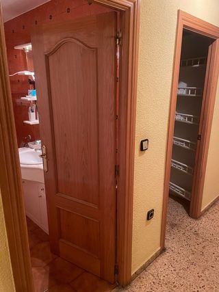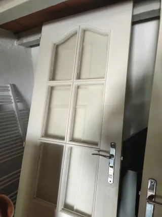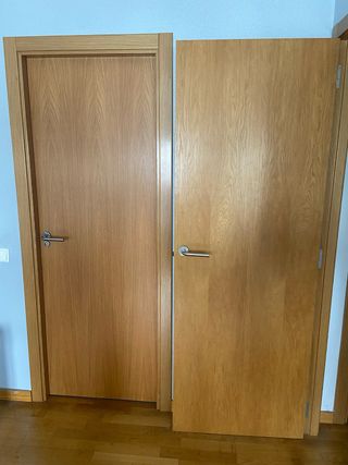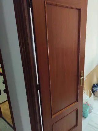 Puerta interior de madera con marco y molduras. - Diseño de madera con vetas. - Marco incluido. -7 macizas y 2 de cristales - Están retiradas de un piso que nunca ha vivido nadie - Algunas tienen marcas de humedad, otras no -15 euros por unidad con todo puerta marco y guarnición -Se vende todo junto, no se vende por unidad