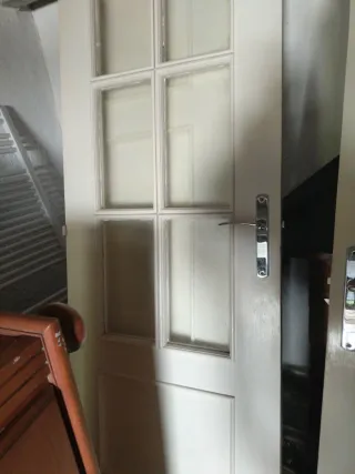 Se venden 3 puertas de madera con detalles de cristal. - Diseño clásico con paneles de madera. - Cristales translúcidos para privacidad. - Tiradores dorados incluidos. Medidas aprox.: • Puerta :60 x 200 cm • Puerta :62 x 194 cm Puerta :72x 203 cm Se venden juntas(100€)o por separado(33€)