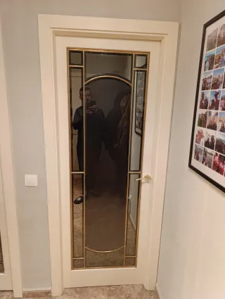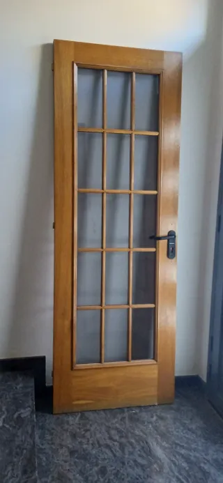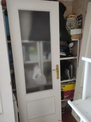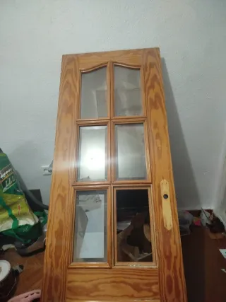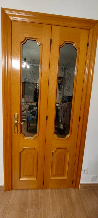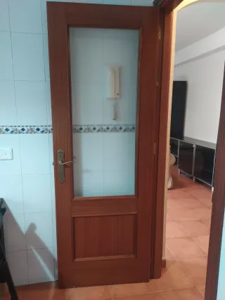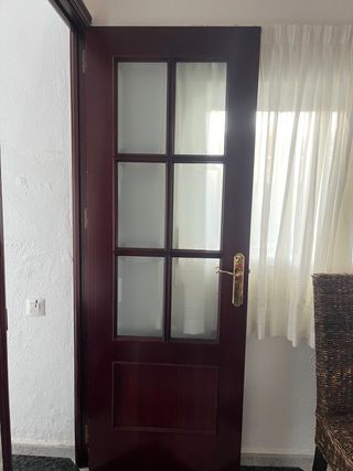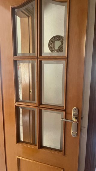 Puerta doble de madera maciza con cristal con manilla metálica color dorado. Medidas 82*203 Tengo también 3 puertas sin cristal de 72*203, dos con cristal de 72*203, otra corredera sin cristal de 62*203 (baño), otra de baño sin cristal de 62*203. Mirar mi perfil. Cada una tiene un precio, negociable si se compran varias