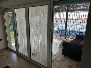 Puerta de patio de aluminio con cristal opaco. - Marco de aluminio blanco. - Cristal opaco para mayor privacidad. Solo tiene un poco deteriorado la parte de abajo del marco porque estaba metido en obra pero eso una vez puesta no se ve 85 ancho x 2 metros de alto