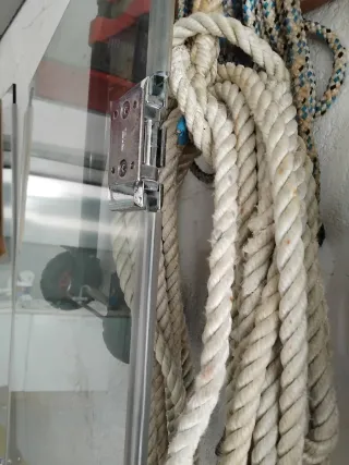 Modelo y medidas en las fotos. Se incluye todo o necesario para su instalación: - Puerta - Guía acero gris - Kit de pinzas de aluminio - 2 tiradores (aluminio y negro) Todo en perfecto estado, no se ha dado uso prácticamente. Solamente recogida.