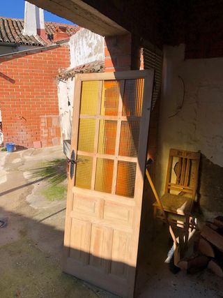 Se venden puertas de madera con detalles de cristal. Puedes comprar una o ambas. Medidas 73*202 con cristal de 45*124, tienen un grosor 3,05cm, una abre a la izquierda y otra hacia la derecha Precio por las dos unidades No incluye envío, a recoger en Silla - Marco de madera color miel. - Panel de cristal con divisiones. - Panel inferior de madera.