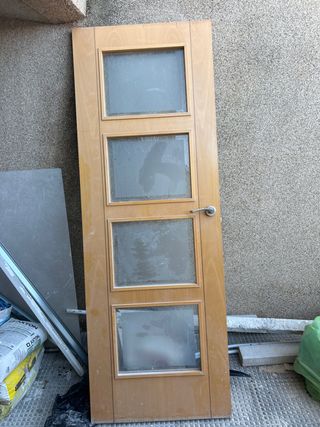 Puerta de madera con un panel de cristal. - Marco de madera. - Panel de cristal esmerilado. 82 x 2,04 cm No está rota ni rayada los puntos y manchas que se ven es de polvo o yeso , solo hay que limpiar y en perfecto estado.