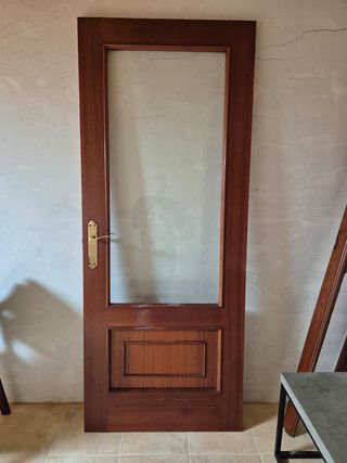 Puerta madera castaño con cristal y marco