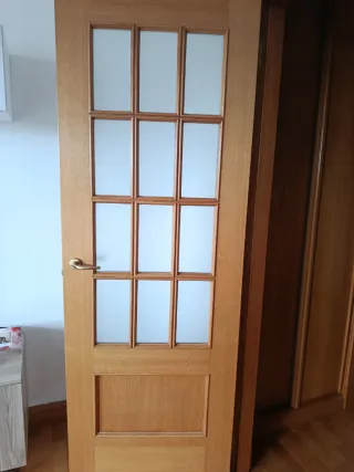 Se venden puertas de madera de interior en buen estado por reforma. Disponibles: • 1 puerta doble de salón con cristal Medidas totales: 125 x 202 cm (2 hojas de 62,5 cm) Precio: 30 € • 2 puertas simples sin cristal y sin pestillo Medidas: 72 x 202 cm Precio: 30 € cada una • 2 puertas simples sin cristal y con pestillo Medidas: 72 x 202 cm Precio: 30 € cada una • 2 puertas simples con cristal y sin pestillo Medidas: 72 x 202 cm Precio: 30 € cada una Ideal para reformas o sustituciones.