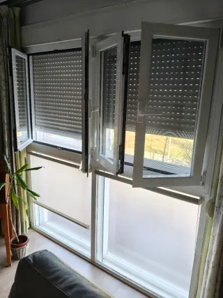 2 Ventanas Alumino Abatibles, con varilla blancas interiores haciendo cuadros , con cristal Climalit Isolar Glass CG58 99 S2 y persianas de Aluminio Blanco. Medidas 148cm de Ancho X 139 de Alto con cajon persiana incluido (400€ x cada una) 1 Puerta Corredera Aluminio Blanco con varilla interior haciendo cuadros, cristal Climalit Isolar Glass CG58 99 S2, con cajon persiana. Medidas 135cm de Ancho por hoja de ventanal X 230 cm de Alto incluido cajon persiana (1000€). No se hacen envios