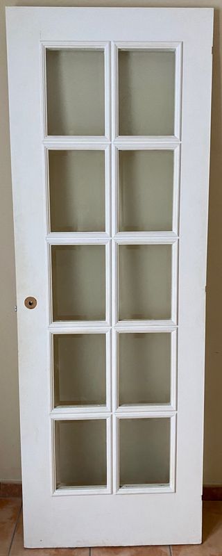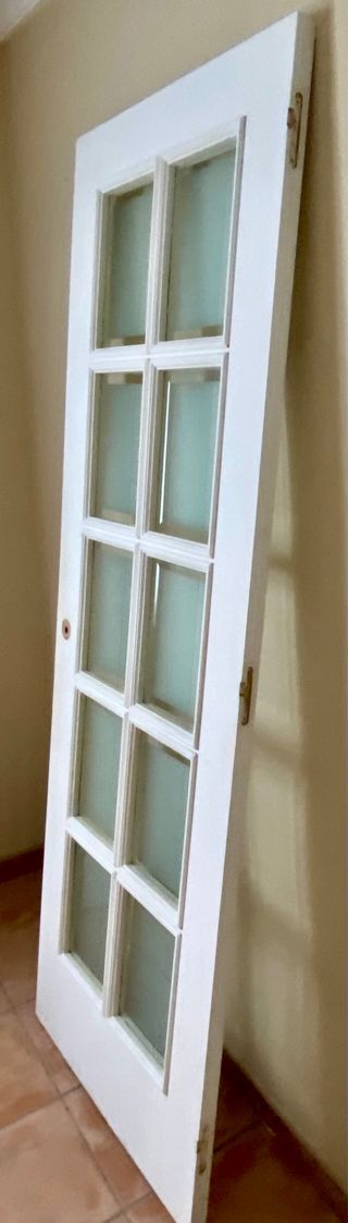 Puerta Lacada en blanco, con 10 cristales al ácido. Esta en buenas condiciones. 81 cm ancho, 35 cm fondo y 202 cm altura. Va con manilla dorada. Apertura hacia la iqda. Solo los cristales valen tres veces más que la puerta.