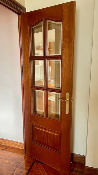 Elegantes puertas interiores de sapeli con detalles de cristal y herrajes dorados. 72 cm de hoja Otras dos puertas individuales con cristales. 72 cm de hoja. Una puerta ciega de 62 cm de hoja. Todas ellas en buen estado y con herrajes de muy buena calidad. 10€ cada una