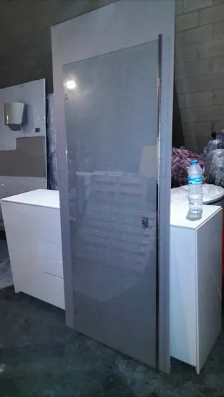 Puerta lacada en blanco con un panel de cristal. Esta nueva. Medida estandar: 202 cm de alto X 81 cm de ancho - Diseño moderno con líneas horizontales.
